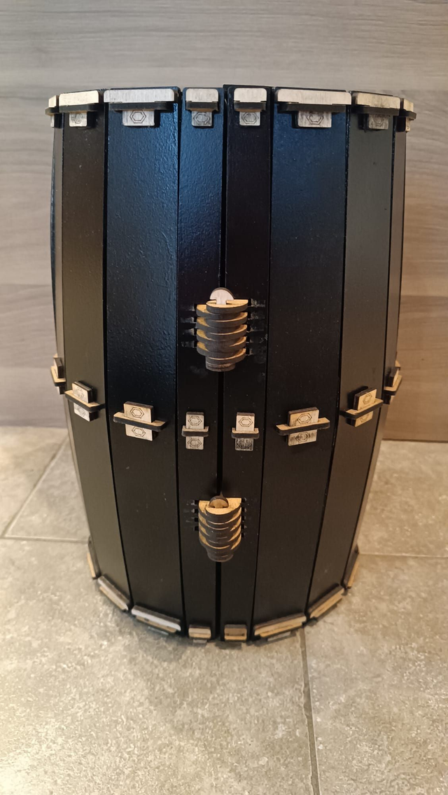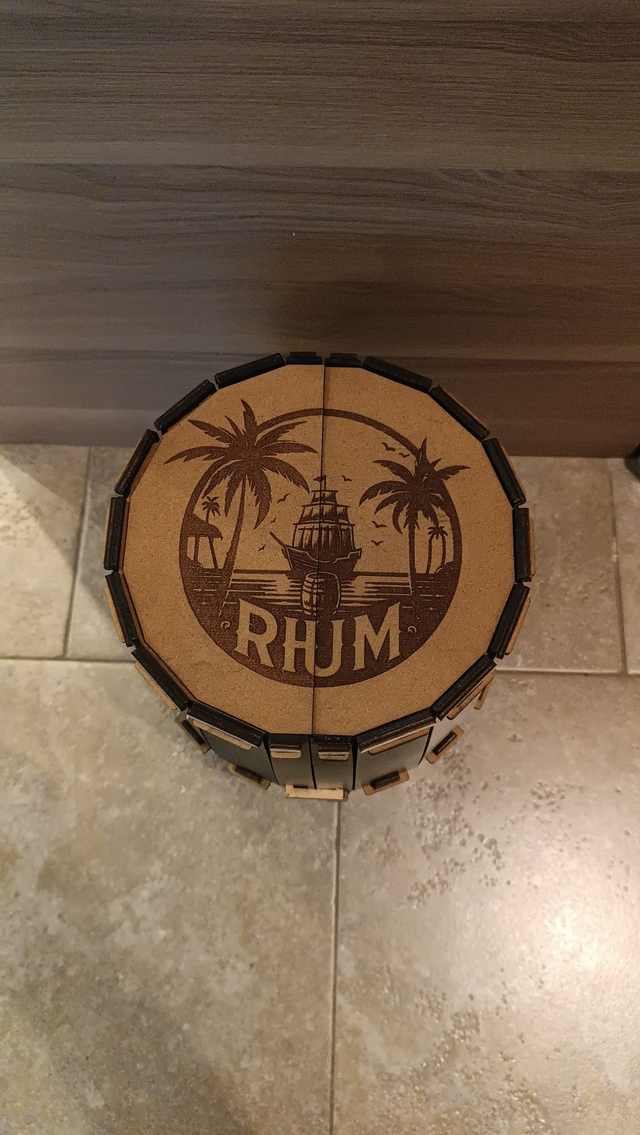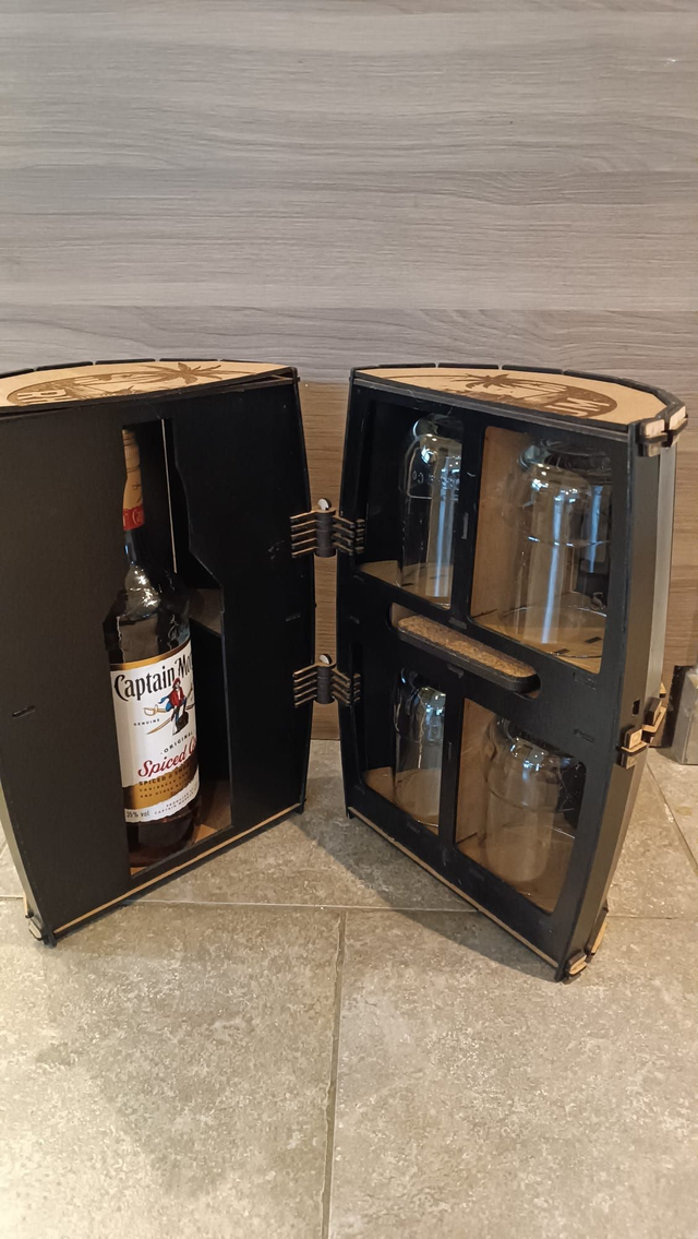 Coffret cadeau en forme de tonneau, fabriqué dans notre atelier à partir de planches de bois découpées et gravées au laser. Un objet déco original qui fait son effet dès l’ouverture : il accueille une bouteille 75 cl (format classique), 4 verres et leurs sous-verres grâce à ses compartiments intégrés.